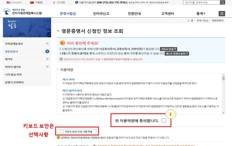 영문증명서 열람/발급 신청 메뉴가 나오면,