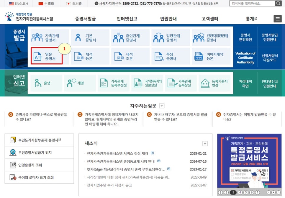 입국하려는 국가에 따라 다르지만, 만 14세 미만의 미성년자는 해외여행을 간다거나 (부모동반 포함) 유학, 이민 등의 이유로 영문가족관계증명서가 필요한 경우가 있다. 서류를 발급 받으려면 주민센터에 방문하여 1천원의 수수료를 내면 발급 받을 수 있지만, 인터넷을 이용하면 무료로 쉽게 발급 받을 수 있다.