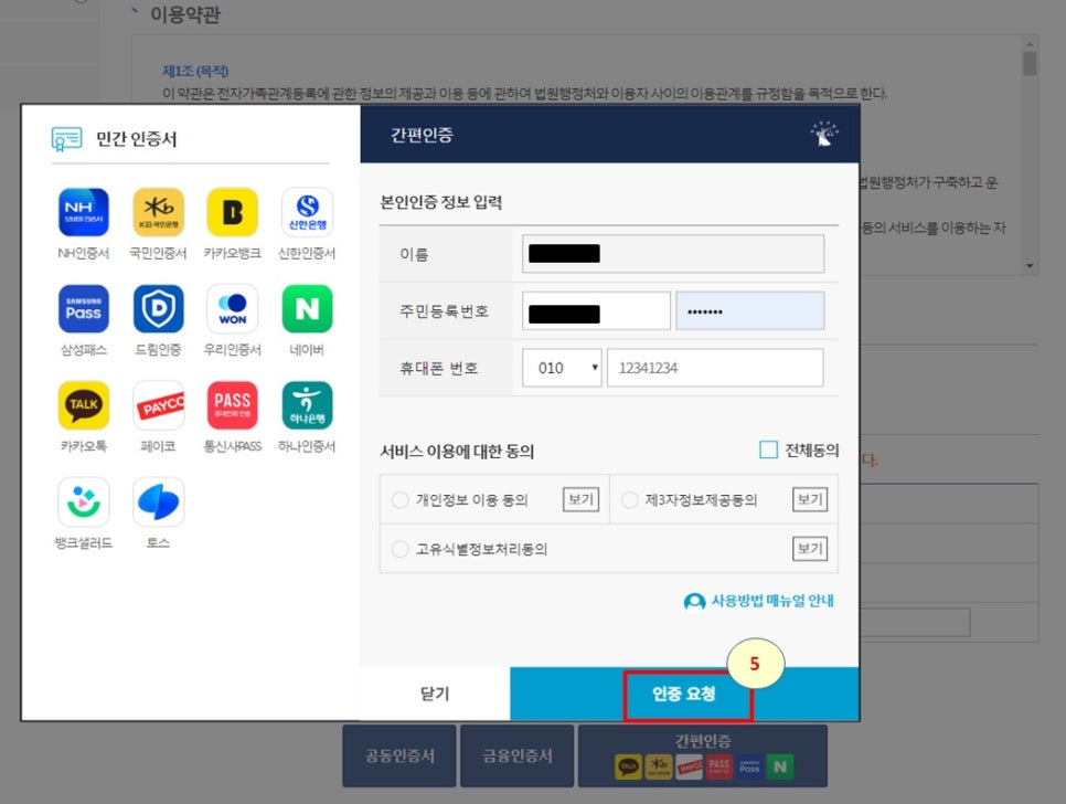 5. 간편인증 중 민간 인증서에서 하나를 선택하고 정보입력 후 인증 요청