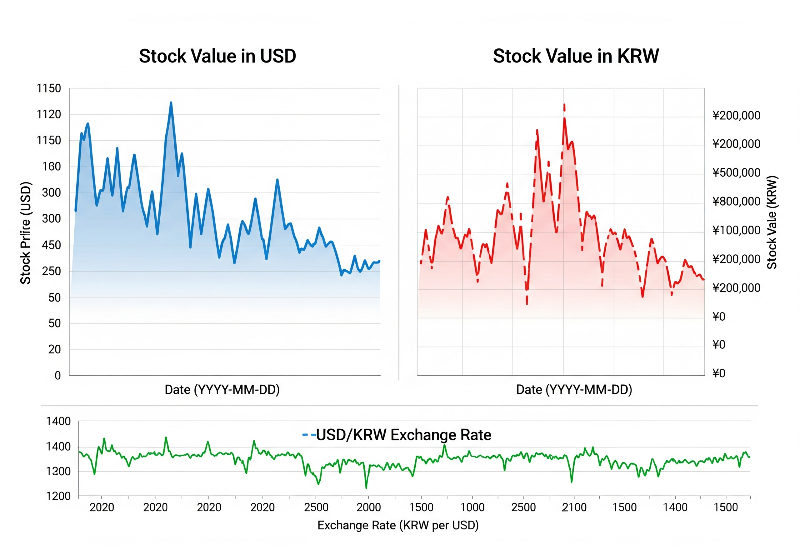 만약 우리가 미국 주식에 투자한다고 가정해보자. 가격이 달러로 표시되기 때문에, 원화로 환산할 때 환율이 중요하다. 예를 들어, 100달러짜리 주식을 샀는데 환율이 1,400원일 때는 14만 원이 필요하다. 그런데 환율이 1,500원으로 올랐다면, 같은 100달러 주식을 사려면 15만 원이 필요하다. 즉, 환율 변동만으로도 원화 기준 투자금이 늘어나거나 줄어드는 것이다.